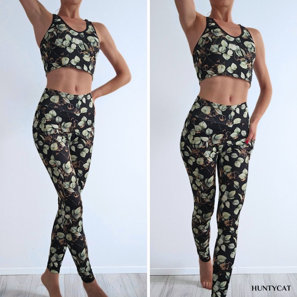 Športový set obsahuje pohodlné elastické legíny s vreckami, prepracovanú športovú podprsenku, ktorá sa dá nosiť aj ako top a pružnú čelenku automaticky ako darček.